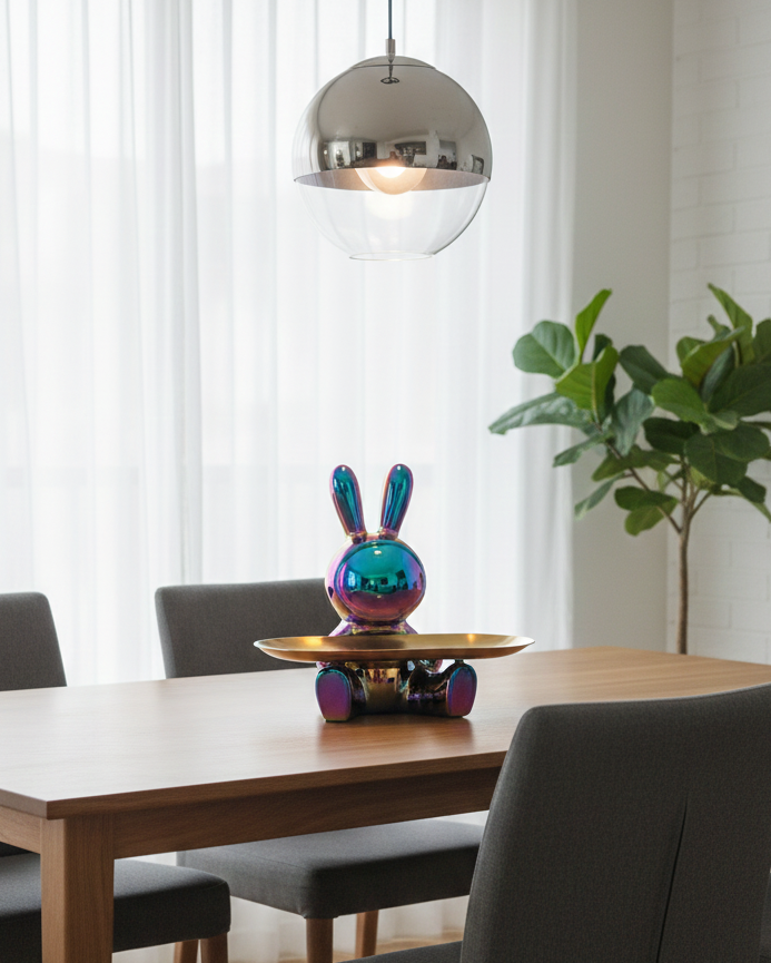 Realizzato con materiali resistenti e finitura metallizzata effetto cangiante, SpaceBunny è progettato per durare nel tempo. La sua superficie liscia facilita la pulizia e mantiene uno scintillio elegante giorno dopo giorno. Ogni dettaglio, dalle orecchie alla base, è studiato per offrire stabilità e raffinatezza.